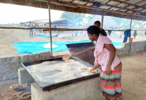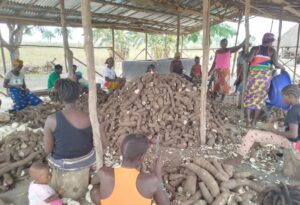 Die Marktpreise sind derzeit ebenfalls sehr niedrig. Ein Großteil der Ernte wurde deshalb zu Gari verarbeitet. Dazu werden die Wurzeln aufwändig durch Schälen, Mahlen, Fermentieren und Trocknen zu einem kohle-hydratreichen grobkörnigen Mehl weiterverarbeitet. Das ist ein gut lagerfähiges Grund-nahrungsmittel in ganz Westafrika.